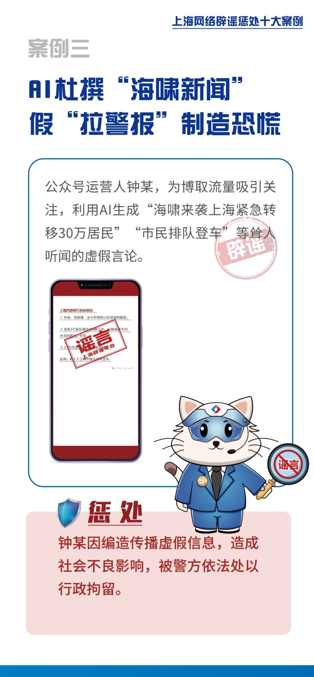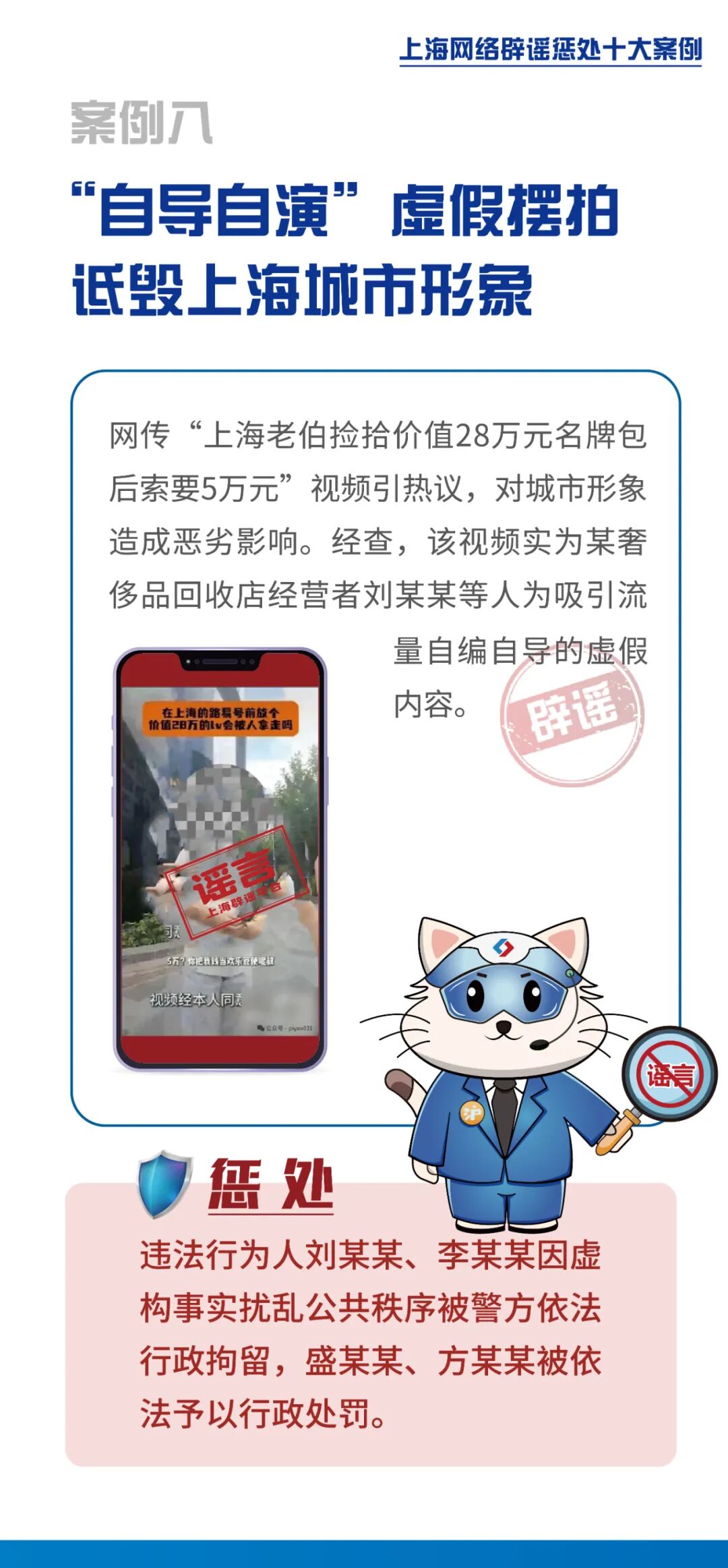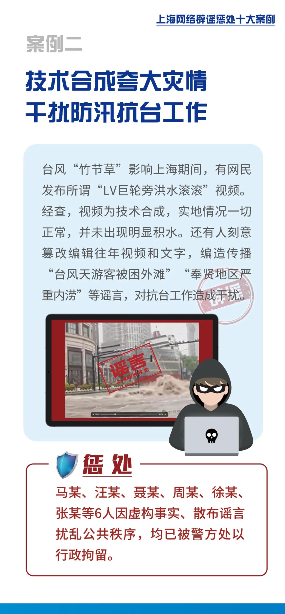 纵观《上海网络辟谣惩处十大案例》,有以下主要特征:一是AI等新技术已成为造谣传谣主要手段,如某网民利用AI生成并发布“海啸来袭上海紧急转移30万居民”虚假消息、“台风天LV巨轮旁洪水滚滚”谣言视频等,对防汛工作造成干扰;二是博流量、逐利益是造谣传谣主要动机,如某奢侈品回收店经营者为起号引流,自编自导自演所谓“上海老伯捡拾名牌包后索要5万元”虚假视频,对城市形象造成恶劣影响;三是相关造谣传谣人员均已被警方依法予以不同形式的处罚,包括封禁账号、处以行政拘留、采取刑事强制措施、判处有期徒刑等,为自己的违法行为付出应有的代价。
