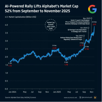 11月25日,谷歌市值突破3.91万亿美元,9月初以来涨幅52%~
