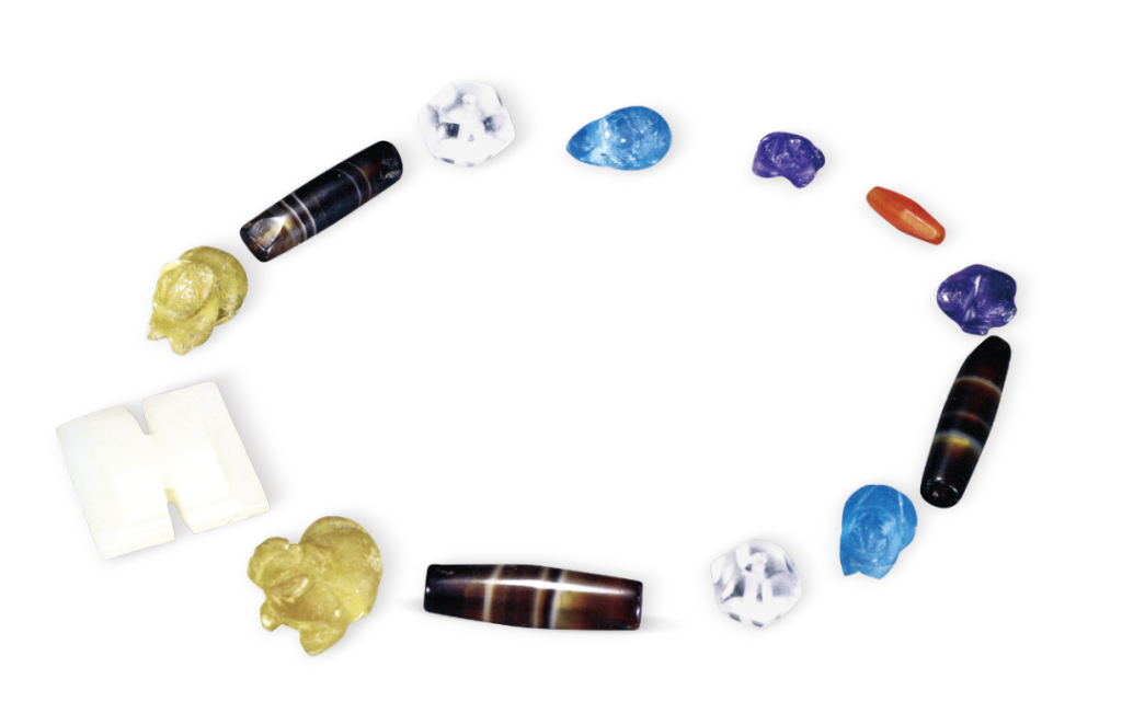 新莽时期微雕杂宝项饰(江苏盱眙金马高速30号墓出土),由琉璃、水晶、玛瑙组成,色彩多样,或许便是汉晋人所认知的“十种流离”