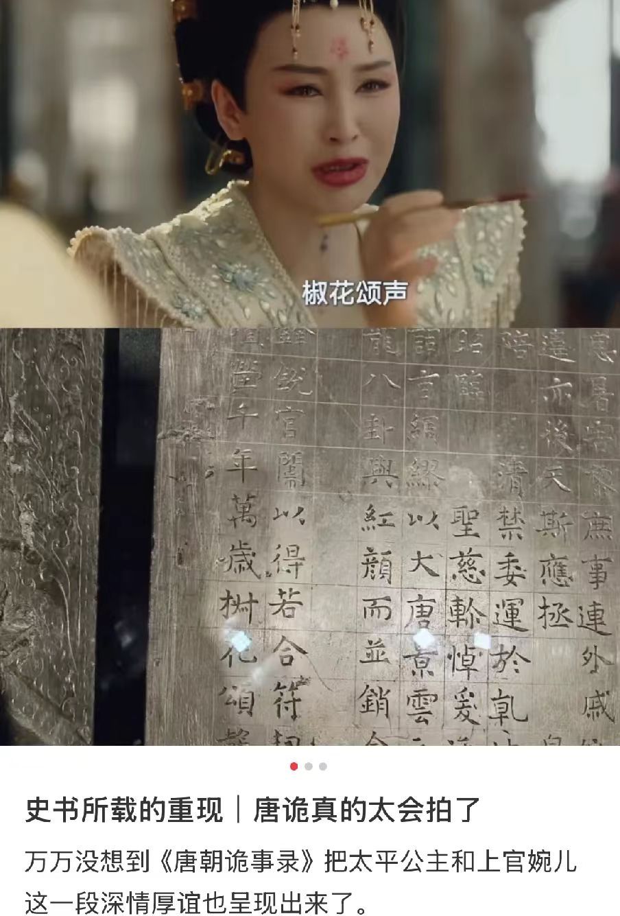以在一众古偶中没用大流量却脱颖而出的《唐朝诡事录》系列为例,其中《白泽的踪迹》一集,太平公主吟诵上官婉儿墓志铭,回忆两人情谊。这里用到一个文物原型——现藏陕西考古博物馆的上官婉儿墓志铭,全文982字,由太平公主亲笔撰写。铭文中“千年万岁,椒花颂声”“太平公主哀伤,赙赠绢五百匹,遣使吊祭,词旨绸缪”等,颠覆了传统史书关于上官婉儿与太平公主敌对的记载,证实太平公主不仅为上官婉儿主持葬礼并承担费用,将她葬入上官家族墓园,并且深深地怀念她。