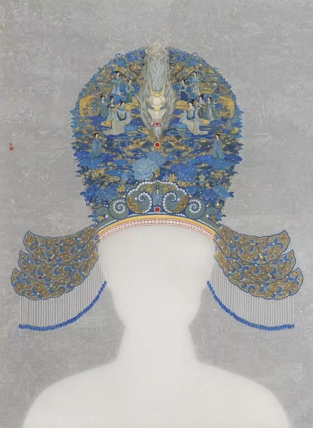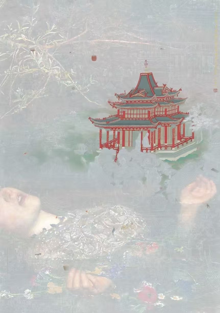 王依雅则以女性身份同时是艺术家的实践,从中国历史中的物象与文本出发,注重抒发个体对生命与文化精神的省思,她重构了仕女、皇后冠、仙观楼阁、花卉等视觉元素,“繁空录”系列中,华贵夺目的皇后冠,展现了一切荣华终归于尘埃的警世恒言;“水上安可居”系列描绘的是烟波浩荡的大海中,由亭台楼阁与繁花构成的仙船正驶向自由极乐的永生世界。仙船既是渡过虚妄、艰险、困厄的载具,也是仙岛本身。“女诫”系列,王依雅尝试挣脱那些诗意的修辞,她用被操纵的皮影、欧洲宫廷的塑身衣、象征禁锢的雕花木板直言不讳,是对被缚的女性命运的喟叹。