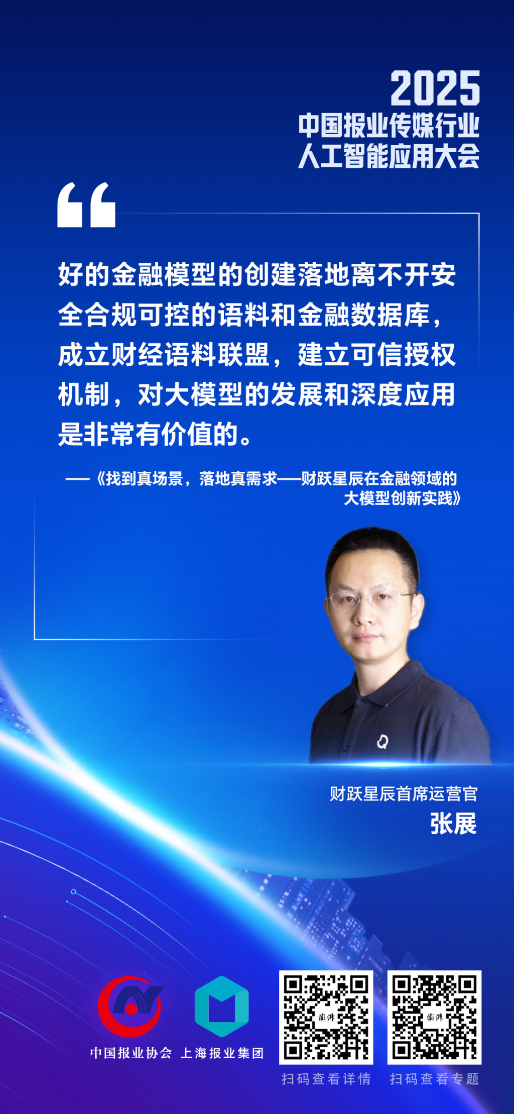 他提出,有关部门可以牵头组织构建行业级别的金融语料库和可信金融数据库,打造金融搜索和合规审核能力。新闻媒体非常注重内容合规安全,财跃星辰有大量的经验可以贡献,双方可以成立财经语料联盟,建立可信授权机制,对大模型的发展和深度应用是非常有价值的。
