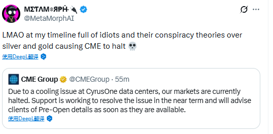 尽管部分投资者对停摆时机表示怀疑,但也有市场声音呼吁保持理性,避免过度解读。网友MΣƬΛM◎Я₱H对社交媒体上充斥的猜测表示了不屑,嘲笑时间线上充满了关于白银和黄金导致芝商所暂停的“阴谋论”。