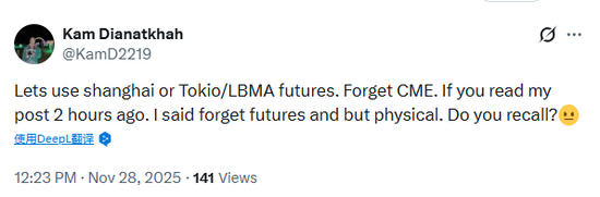 对于这一突发状况,部分投资者开始呼吁转向其他市场或实物资产。网友Kam Dianatkhah表示:“忘了芝商所吧。正如我两小时前所说,忘掉期货,买入实物。”他还建议投资者转战上海、东京或伦敦金银市场协会(LBMA)的期货市场。