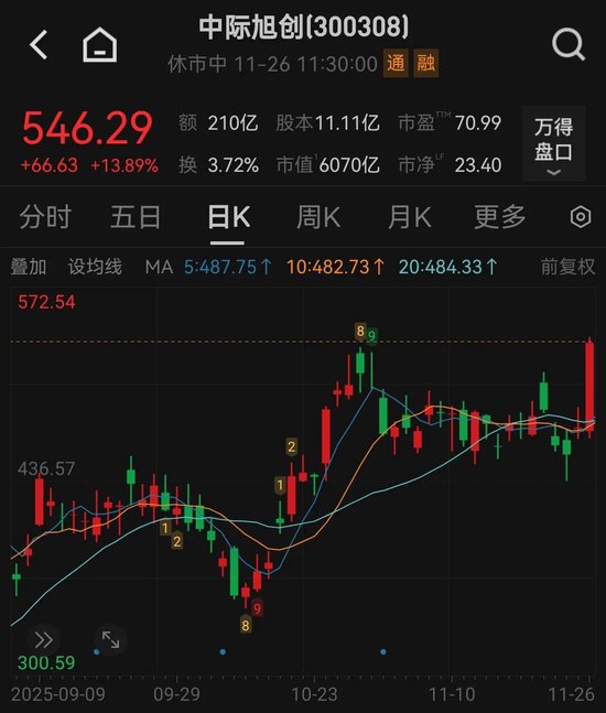 今日盘中,多只谷歌概念股股价走强,光模块公司尤为活跃。光模块公司“易中天”中,早盘涨13.89%,股价546.29元/股,创历史新高,市值突破6000亿元。早盘则涨10.44%,涨6.87%。
